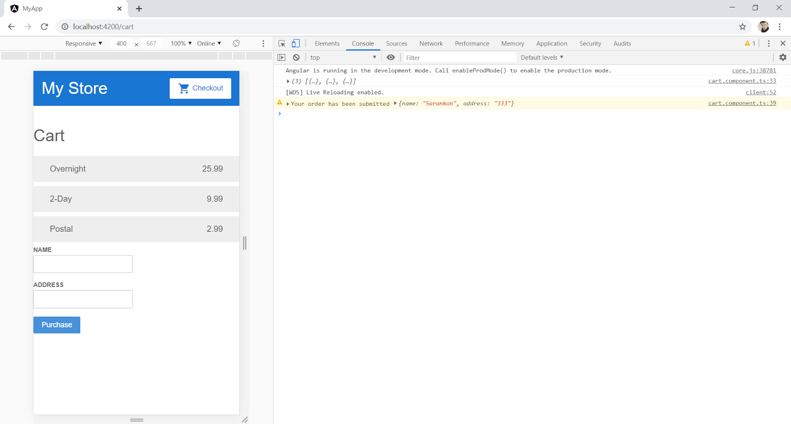 <h1>Cart</h1> <div class="cart-item" *ngFor="let item of items; index as itemId"> <span>{{item.name}}</span> <span>{{item.price | currency }}</span> </div> <div class="shipping-item" *ngFor="let shippingPrice of shippingPrices | async"> <span>{{shippingPrice.type}}</span> <span>{{shippingPrice.price}}</span> </div> <form [formGroup]="checkoutForm" (ngSubmit)="onSubmit(checkoutForm.value)"> <div> <label for="name">Name</label> <input id="name" type="text" formControlName="name"> </div> <div> <label for="address">Address</label> <input id="address" type="text" formControlName="address"> </div> <button class="button" type="submit">Purchase</button> </form>